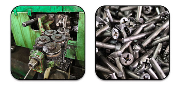 Blank screws with formed heads and slots are cold-formed at room temperature to produce fine, sharp, single-start threads. A vibratory feeder aligns the screws for entry into a two-plate flat die thread rolling machine, where the moving die rolls the shank to form threads. Finished screws are collected for heat or surface treatment. Output: 250–350 pcs/min (for 3.5x25 fine-thread sharp-tip drywall screws).